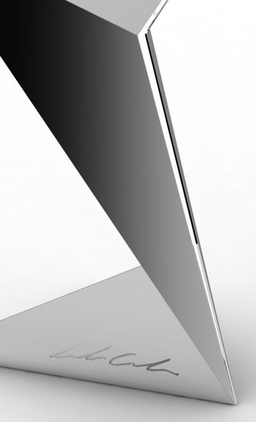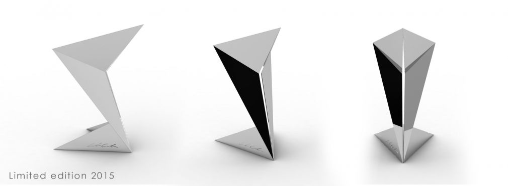 E' la voglia di creare un'oggetto, che anche se statico, provi a dare insieme alla luce, un effetto di movimento, di slancio verso un punto, verso l'alto. Le forme geometriche, dagli angoli netti e da pieghe definite, tendono a richiamare i veivoli di nuova concezione, dando una sensazione aereodinamica alla lampada. La scelta dei led come fonte luminosa, e dal materiale non trasparente serve per creare insieme alla luce, effetti netti e geometrici anche nell'iluminazione.